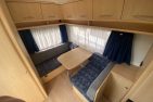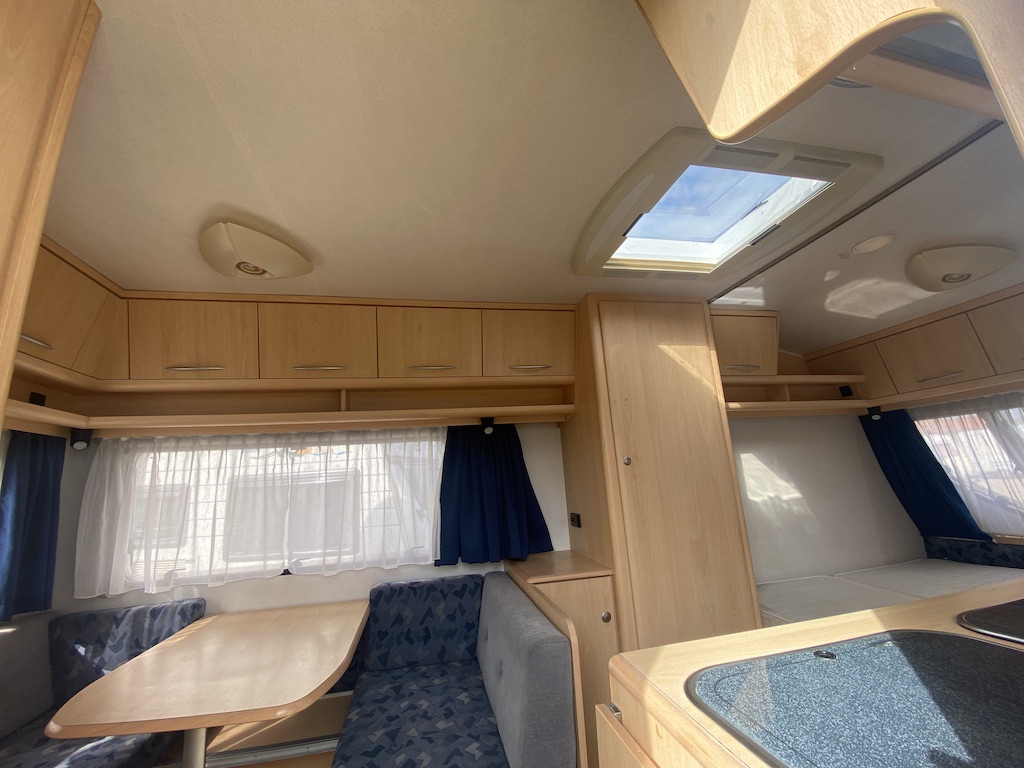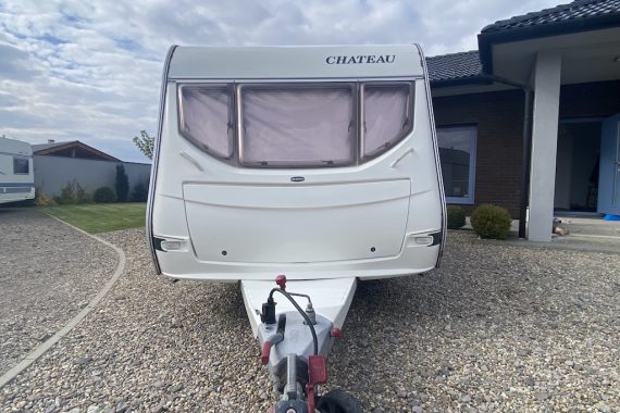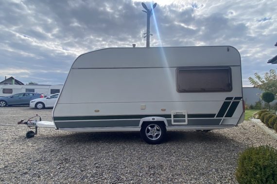 Rulota second-hand Chateau Calista 430 CT an de fabricatie 2003, ce are in dotare o bucatarie cu chiuveta inox si robinet, aragaz, frigider functional pe gaz 12V/220V, sistem de incalzire Trumavent, trape de aerisire, baie cu wc fix ecologic, cu golire exterioara, cadita de dus, boiler cu apa calda. Rulota este compartimentat dublu: in fata si in spate se afla cate doua banchete cu o masa din care se face un pat pentru doua persoane. Toate geamurile se deschid si au plase antitantari, jaluzele atermice, perdele si draperii. Rulota are un cort inchis de 12 m2, carlig antibalance, butelie gpl… Rulota se afla intr-o stare impecabila, fara mirosuri si infiltratii!!!