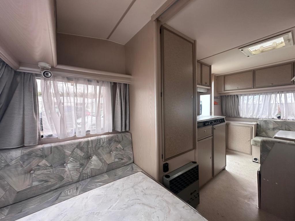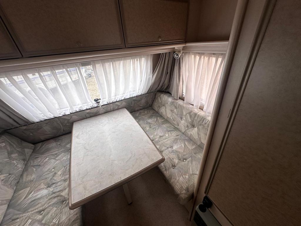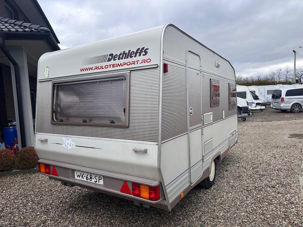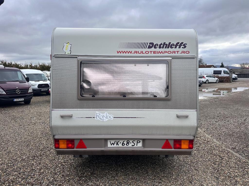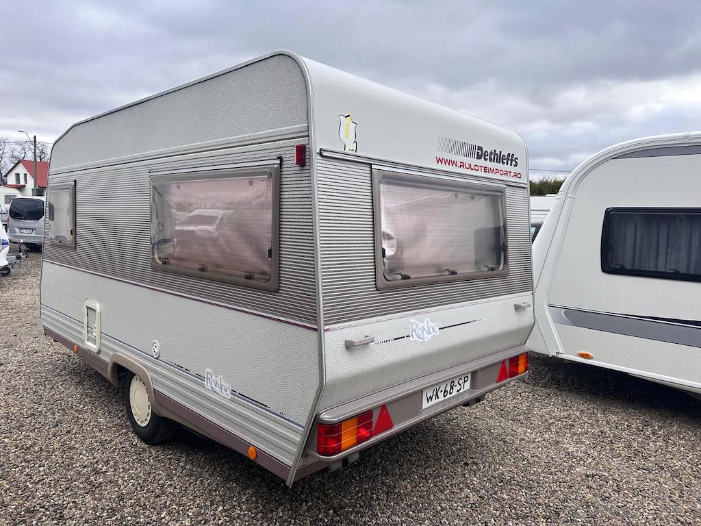 Rulota second-hand Dethleffs New-Line , an de fabricatie 1993, ce are in dotare o bucatarie cu chiuveta inox si robinet, aragaz, frigider functional pe gaz 12V/220V, sistem de incalzire Trumatic, trape de aerisire, baie cu wc fix ecologic, cu golire exterioara. Rulota este compartimentat dublu: in fata se afla doua banchete cu o masa, din care se face un pat de 1.50m x 2 m, iar in spate dintr-o masa si doua banchete se face un pat pt. o persoana. Toate geamurile se deschid si au plase antitantari, jaluzele atermice, perdele si draperii. Rulota are un cort inchis, carlig antibalance… Rulota se afla intr-o stare buna, fara mirosuri si infiltratii!!!