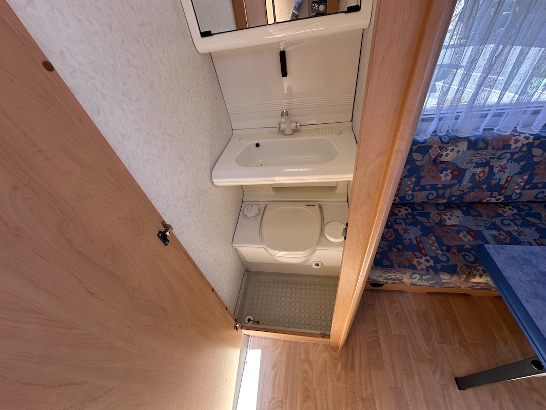Rulota second hand: Hobby De Luxe, an de fabricatie 2000, ce are in dotare o bucatarie cu chiuveta inox si robinet, aragaz, frigider functional pe gaz 12V/220V, sistem de incalzire Trumatic, trape de aerisire, baie cu wc fix ecologic, cu golire exterioara, cadita de dus. Rulota este compartimentata dublu: in fata si in spate se afla cate doua randuri de banci cu o masa, din care se poate face cate un pat. Toate geamurile se deschid si au plase antitantari, jaluzele atermice, perdele si draperii. Rulota are un cort inchis, carlig antibalance, butelie gpl…Rulota se afla intr-o stare impecabila, fara mirosuri si infiltratii!!!