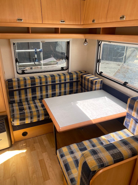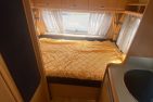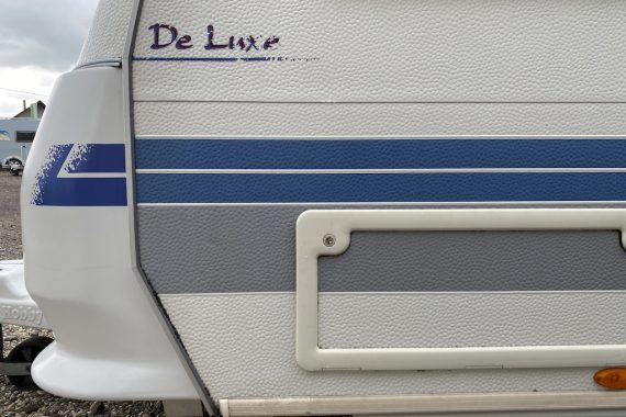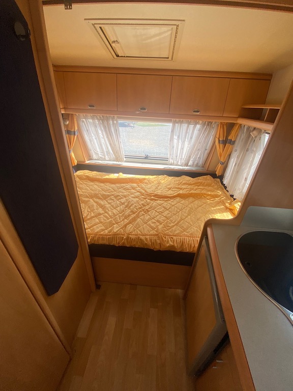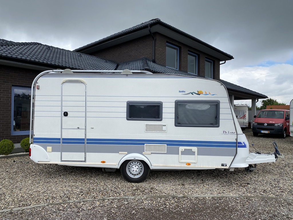 Rulota second hand: Hobby De Luxe, an de fabricatie 2001, ce are in dotare o bucatarie cu chiuveta inox si robinet, cuptor cu microunde, aragaz, frigider functional pe gaz 12V/220V, sistem de incalzire Trumavent, trape de aerisire, baie cu wc fix ecologic, cu golire exterioara, cadita de dus. Rulota este compartimentata dubla: in fata se afla un pat fix de 2 m x 1.80 m, iar in spate se afla doua banchete cu o masa, din care se face un pat de marimea 1.80 m x 1.45 m. Toate geamurile se deschid si au plase antitantari, jaluzele atermice, perdele si draperii. Rulota are un cort inchis, carlig antibalance, butelie gpl…Rulota se afla intr-o stare impecabila, fara mirosuri si infiltratii!!!