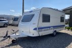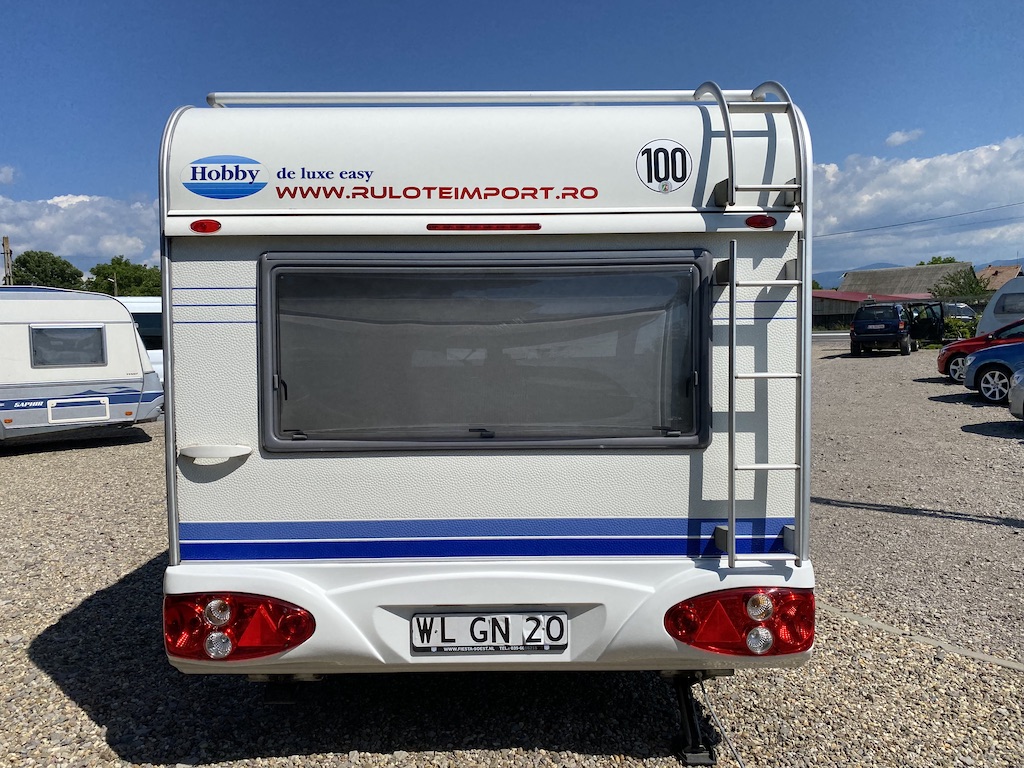 Rulota second hand: Hobby De Luxe Easy, an de fabricatie 2004, ce are in dotare o bucatarie cu chiuveta inox si robinet, aragaz, frigider functional pe gaz 12V/220V, sistem de incalzire Trumavent, trape de aerisire, baie cu wc fix ecologic, cu golire exterioara, cadita de dus. Rulota este compartimentata dubla: in fata se afla un pat fix de 2 m x 1.80 m, iar in spate se afla un coltar cu o masa, din care se face un pat de marimea 2.0 m x 1.45 m. Toate geamurile se deschid si au plase antitantari, jaluzele atermice, perdele si draperii. Rulota are un cort inchis, carlig antibalance, butelie gpl…Rulota se afla intr-o stare impecabila, fara mirosuri si infiltratii!!!