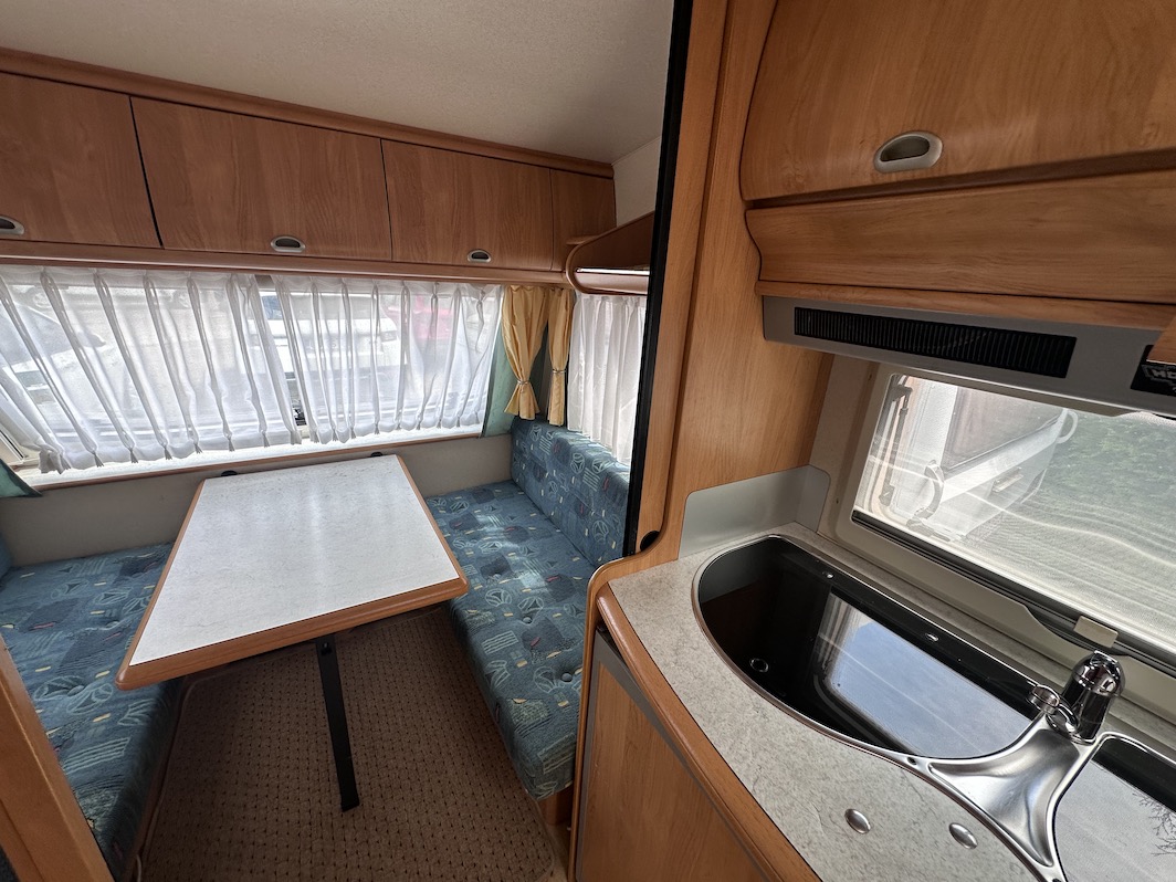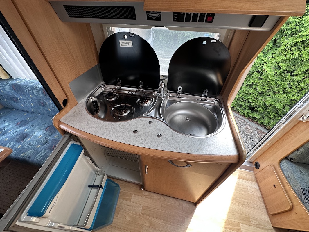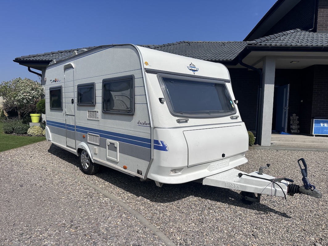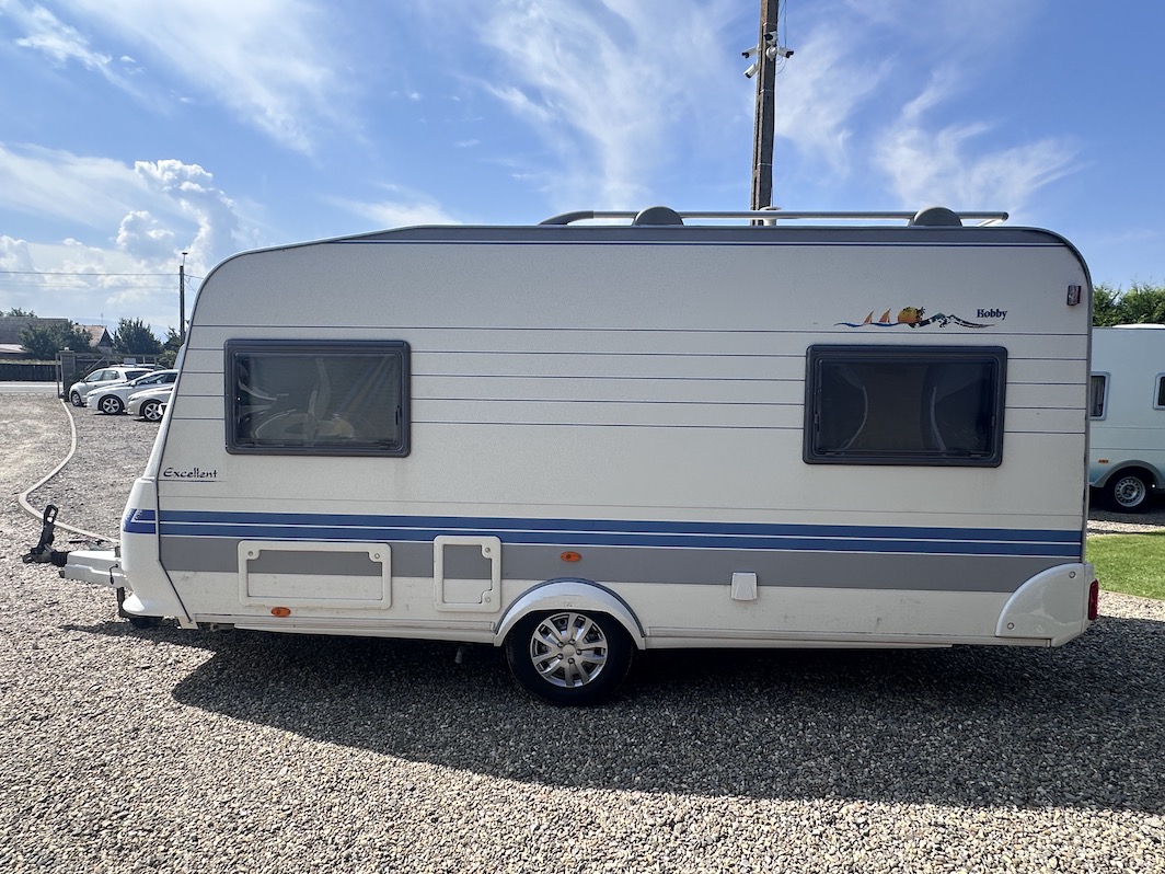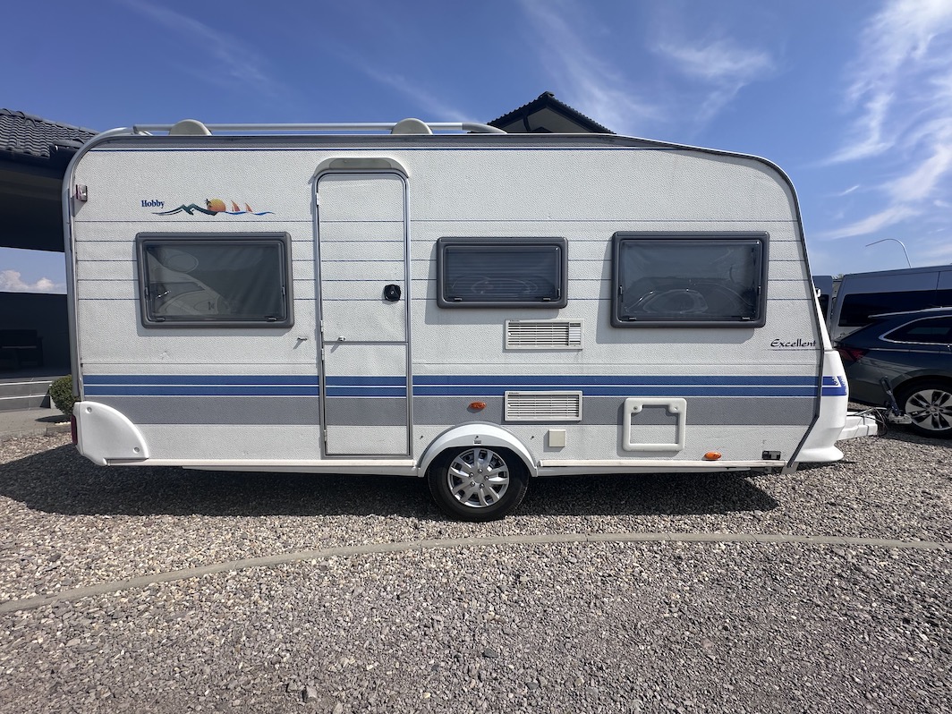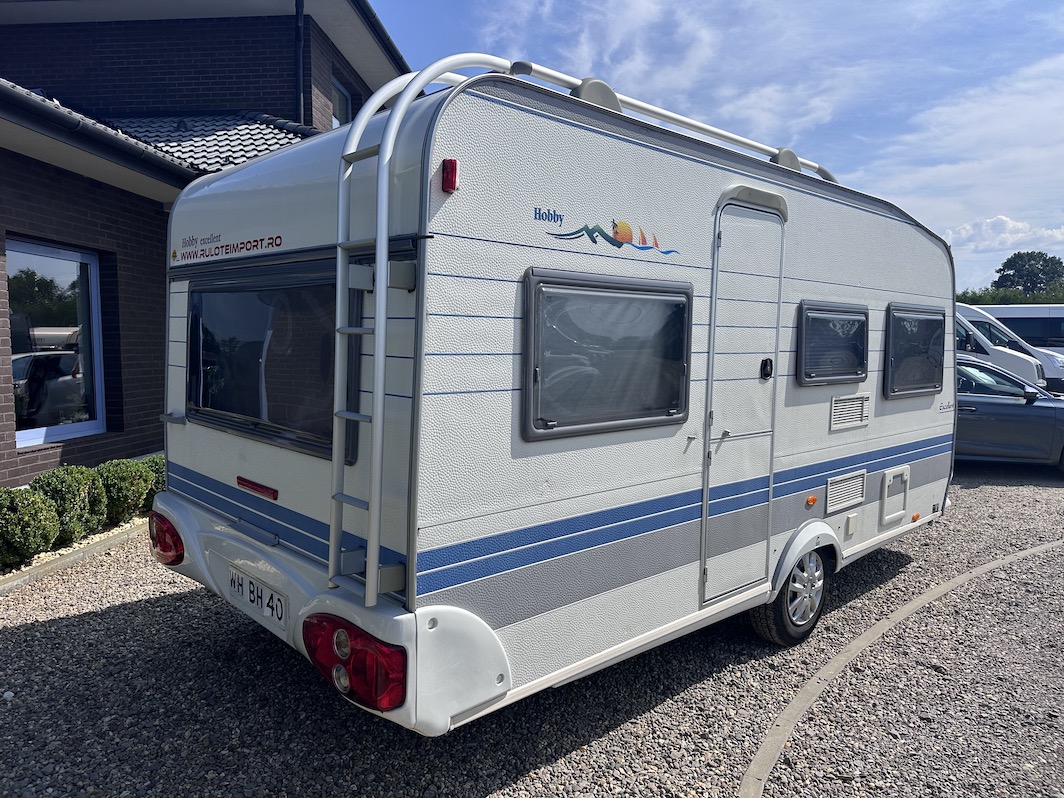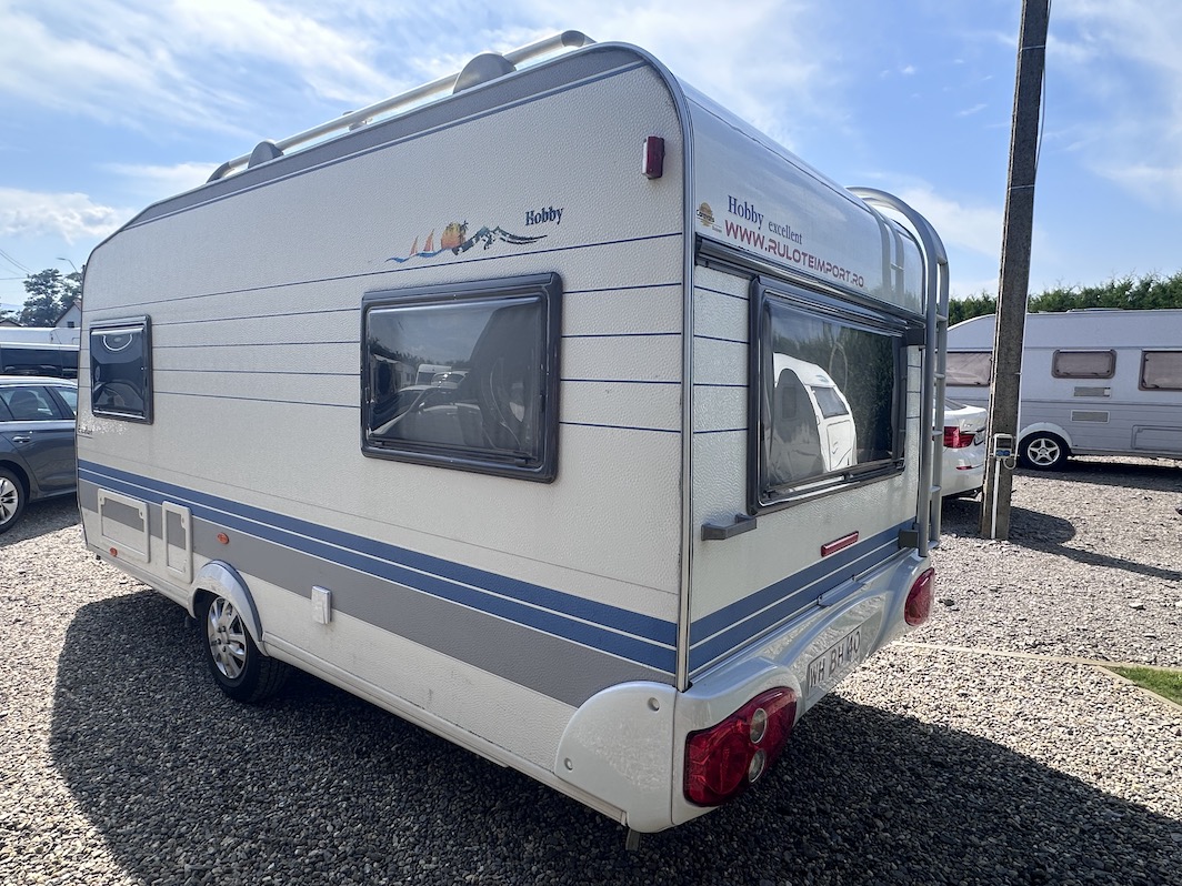 Rulota second hand: Hobby Exclusive 450 UB, an de fabricatie 2003 , cu RAR efectuat, cu carte in Romania, ce are in dotare o bucatarie cu chiuveta inox si robinet, aragaz, frigider functional pe gaz 12V/220V, sistem de incalzire Trumavent, trape de aerisire, baie cu wc fix ecologic, cu golire exterioara, cadita de dus. Rulota este compartimentat dublu: in fata se afla un coltar mare din care se face un pat de 2-3 persoane, iar in spate se afla doua banchete cu o masa, din care se face un pat de marimea 1.80 m x 1.45 m. Toate geamurile se deschid si au plase antitantari, jaluzele atermice, perdele si draperii. Rulota are un cort inchis, carlig antibalance, butelie gpl…Rulota se afla intr-o stare foarte buna, fara mirosuri si infiltratii!!!