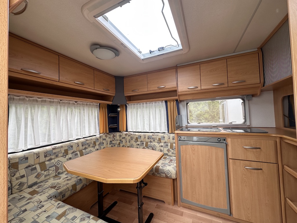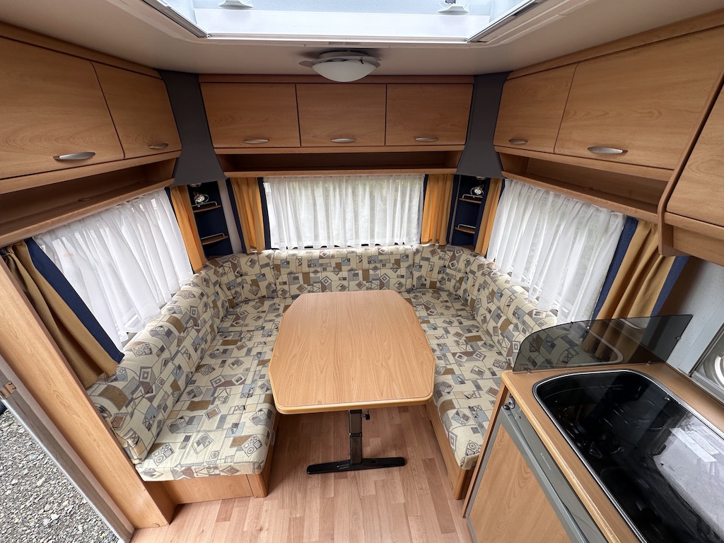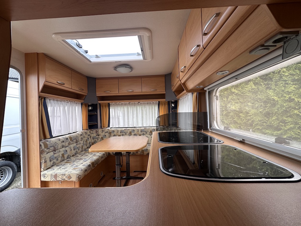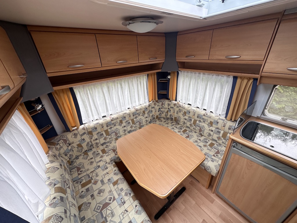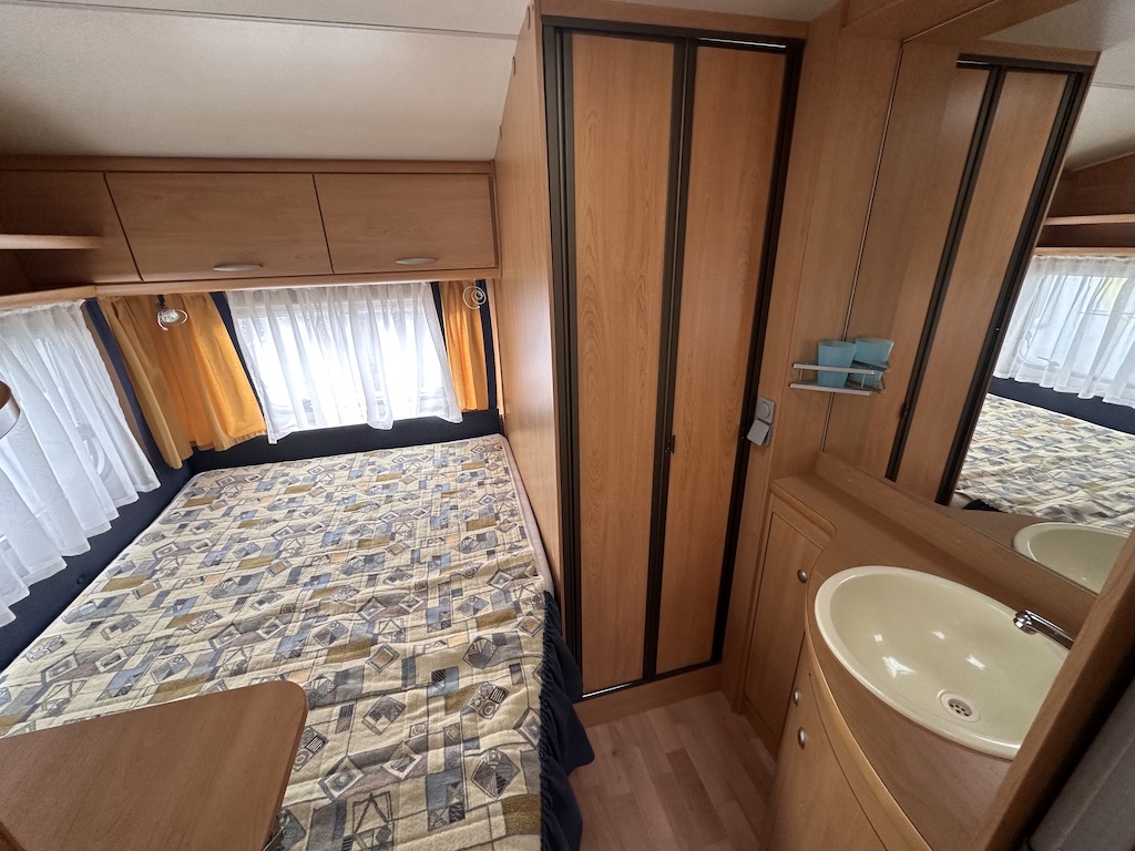 Rulota second-hand Knaus Sport 450 TUF Sudwind, an de fabricatie 2003, ce are in dotare o bucatarie cu chiuveta inox si robinet, aragaz, frigider functional pe gaz 12V/220V, sistem de incalzire Trumatic, incalzire in podea, trape de aerisire, baie cu wc fix ecologic, cu golire exteriora, cadita de dus. Rulota este compartimentata dubla, in fata se afla un pat patrimonial, iar in spate un coltar cu o masa, din care se face un pat de 1.40m x 2 m. Toate geamurile se deschid si au plase antitantari, jaluzele atermice, perdele si draperii. Rulota are un cort mare, carlig antibalance, butelie gpl… Rulota se afla intr-o stare buna, fara mirosuri si infiltratii!!!